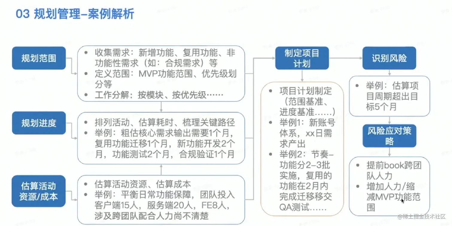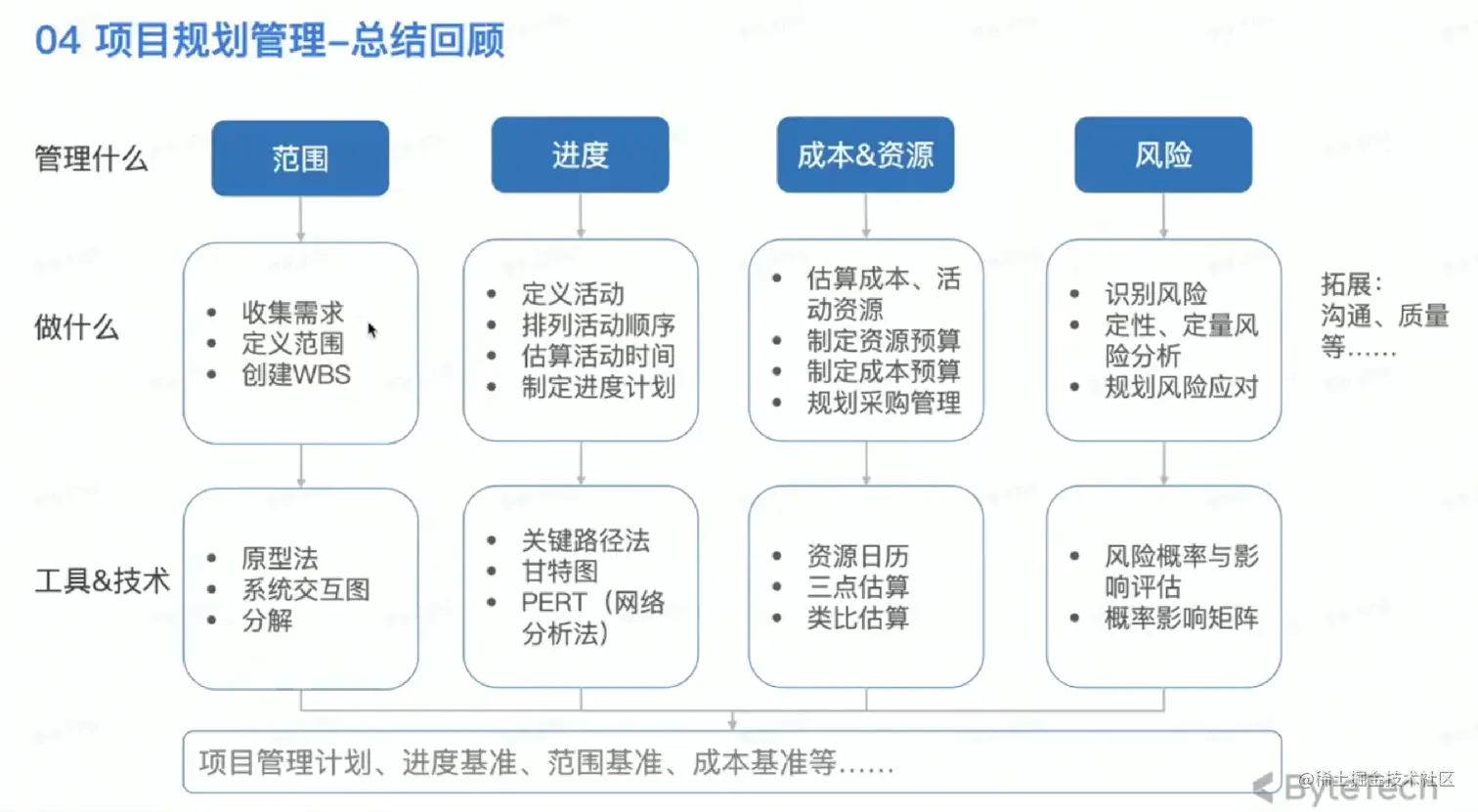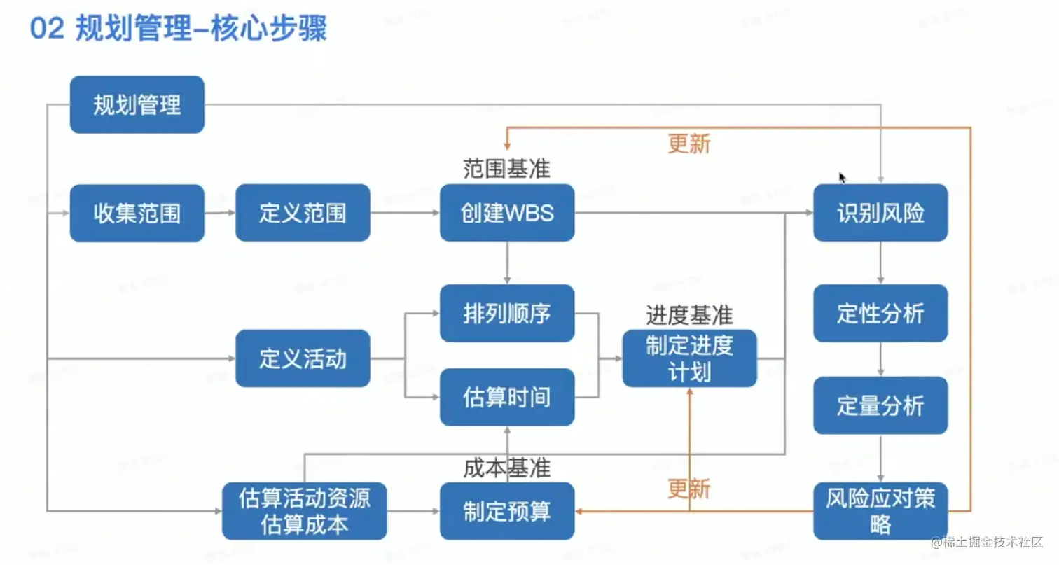 2、规划过程组:明确项目范围,优化目标,为实现目标而制定行动方案的一组过程。
