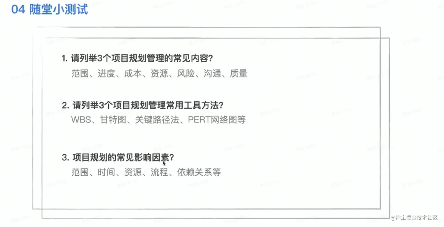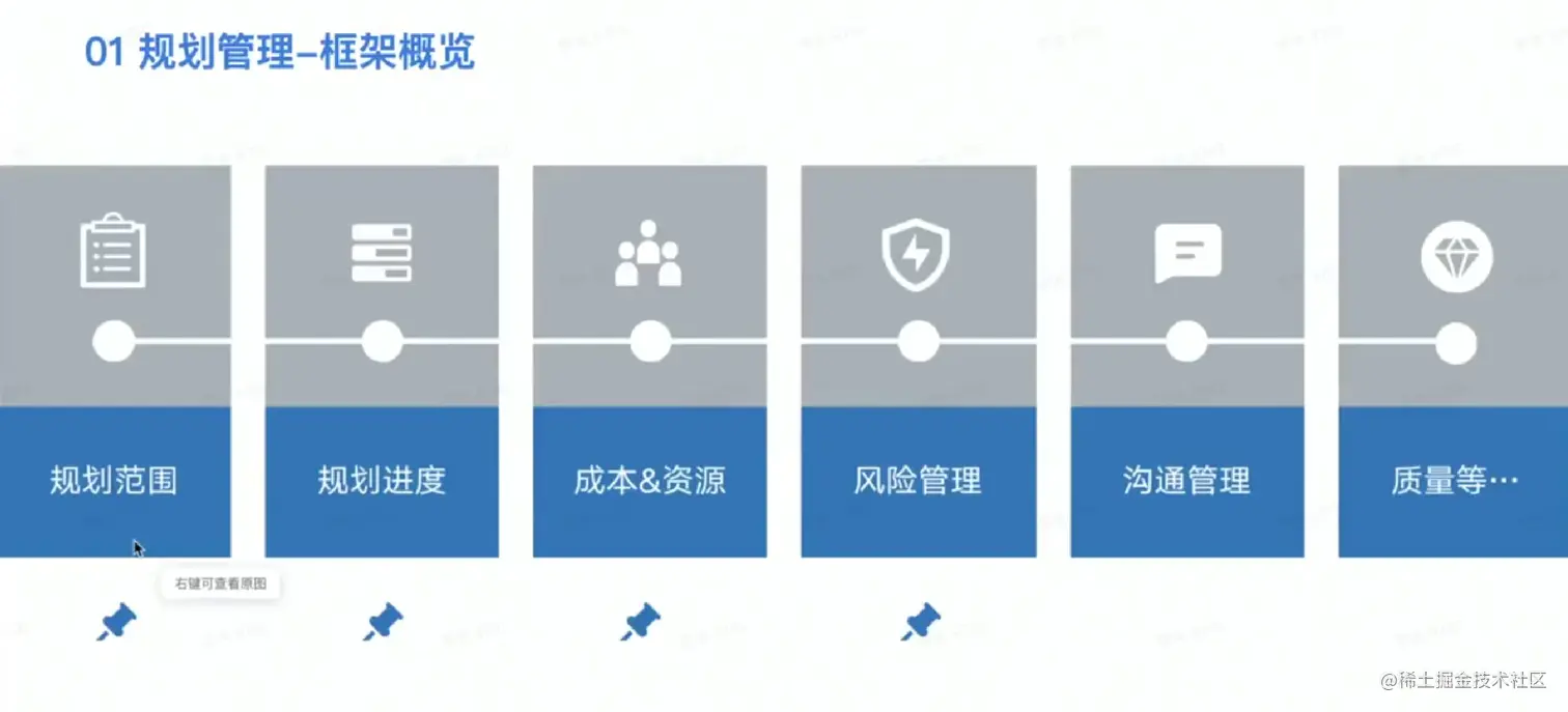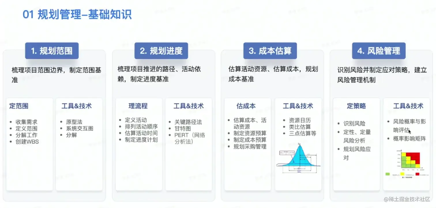2、规划过程组:明确项目范围,优化目标,为实现目标而制定行动方案的一组过程。