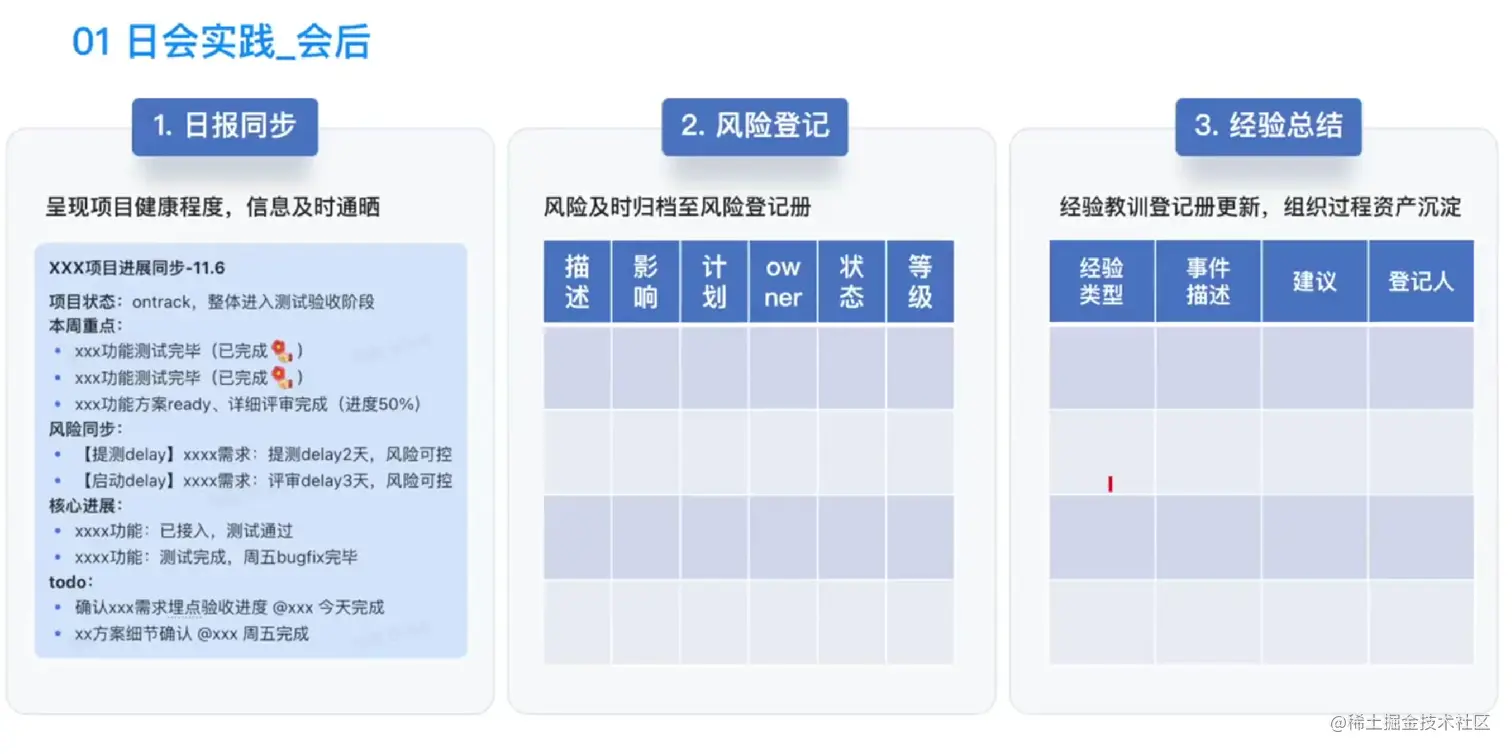 每日Scrum会议(Daily Scrum):每天团队成员进行的15分钟短会,分享过去一天的工作、今天的工作计划和遇到的障碍。