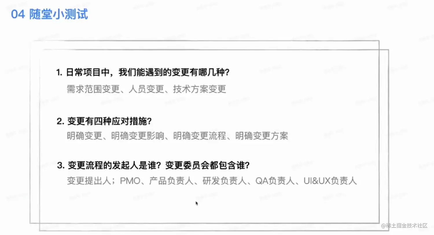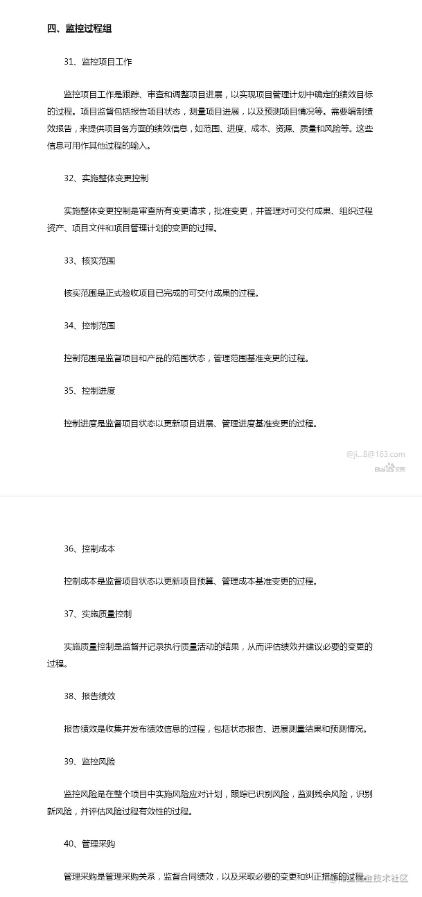 4、监控过程组:跟踪、审查和调整项目进展与绩效,识别必要的计划变更并启动相应变更的一组过程。