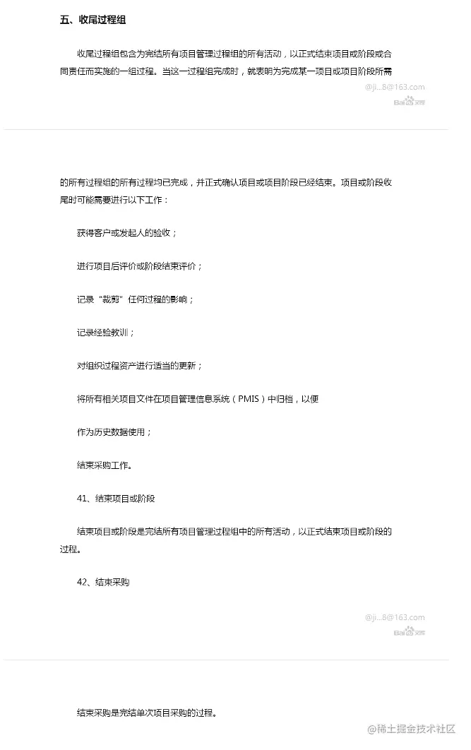 5、收尾过程组:为完结所有过程组的所有活动以正式结束项目或阶段而实施的一组过程。