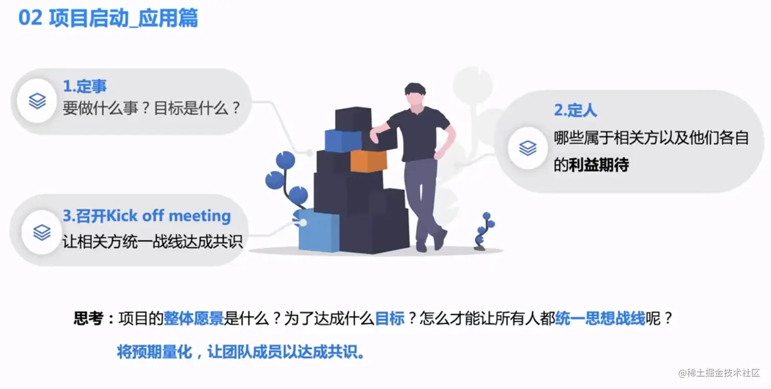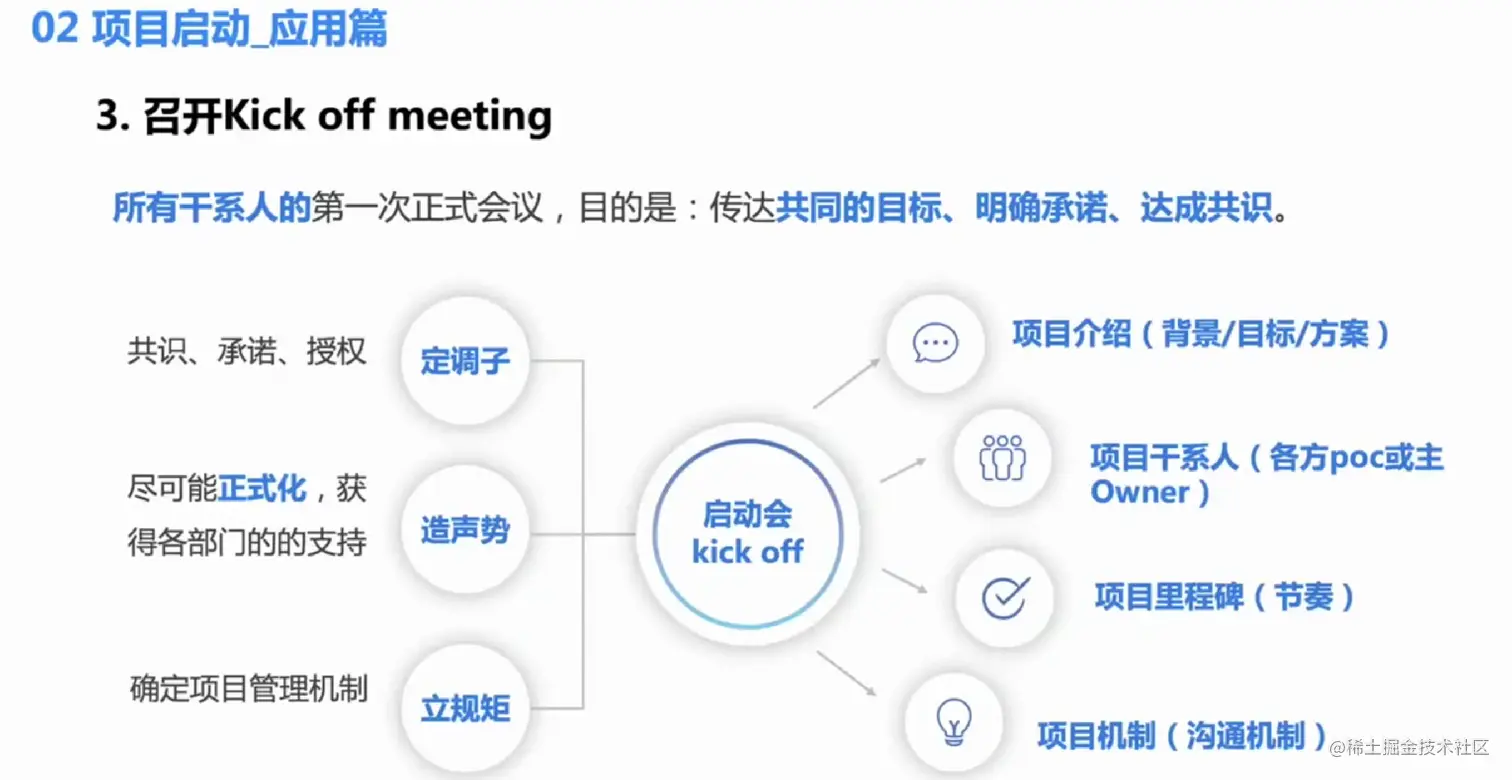 通过项目启动会公布,反映干系人的需求和期望,运营目标和重要里程杯,确定职责分工和沟通机制。
