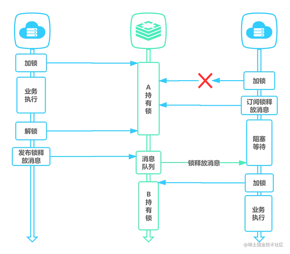 - 另一种方式是使用 Redis 的发布订阅功能,当获取锁失败时,订阅锁释放消息,获取锁成功后释放时,发送锁释放消息。如下: