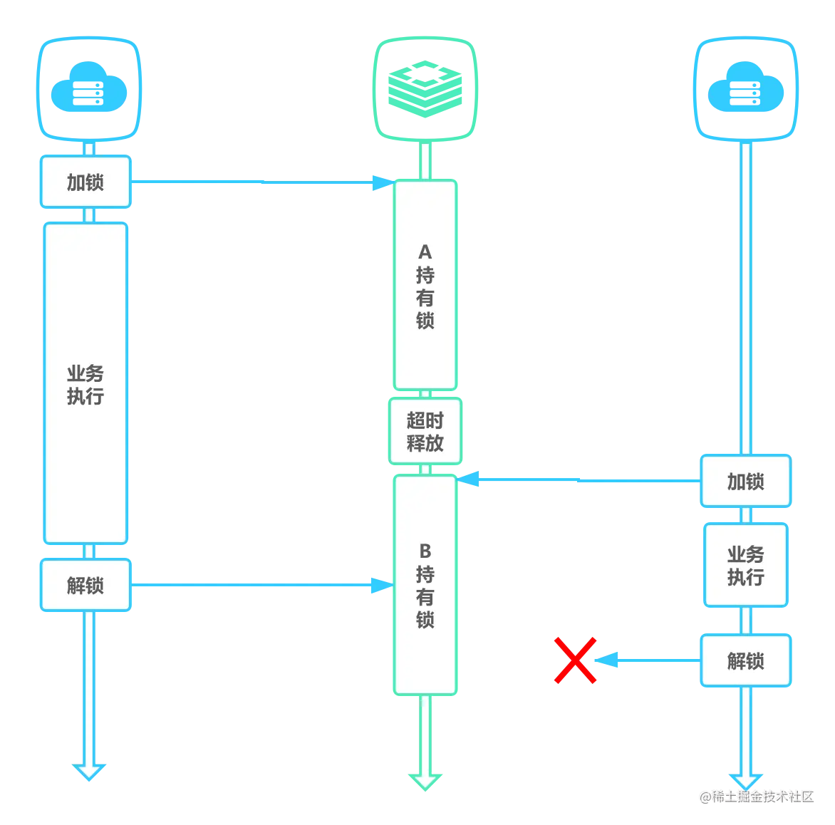 如果线程 A 成功获取到了锁,并且设置了过期时间 30 秒,但线程 A 执行时间超过了 30 秒,锁过期自动释放,此时线程 B 获取到了锁;随后 A 执行完成,线程 A 使用 DEL 命令来释放锁,但此时线程 B 加的锁还没有执行完成,线程 A 实际释放的线程 B 加的锁。