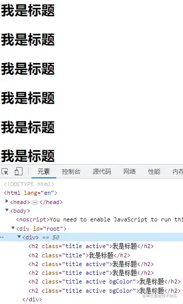 <h2 className={classNames({ title: true, active: true })}>我是标题</h2>
