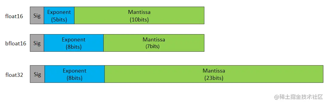 其中如果指数位全为 0 时,且尾数位全为 0 时表示数字 0。 如果指数位全为 0,尾数位不全为 0 则表示一个非常小的数值。 当指数全为 1,尾数位全为 0 表示根据符号位正无穷大,或者负无穷大。 若指数全为 1,但是尾数位不为 0,则表示 NAN。bfloat16 并不属于一个通用的数据类型,是 Google 提出的一种特殊的类型,现在一般只在一些 TPU 上训练使用,其指数位数与 float32 的位数保持一致,可以较快的与 float32 进行数据转换。由于 bfloat16 并不是一种通用类型,IEEE 中也并没有提出该类型的标准。