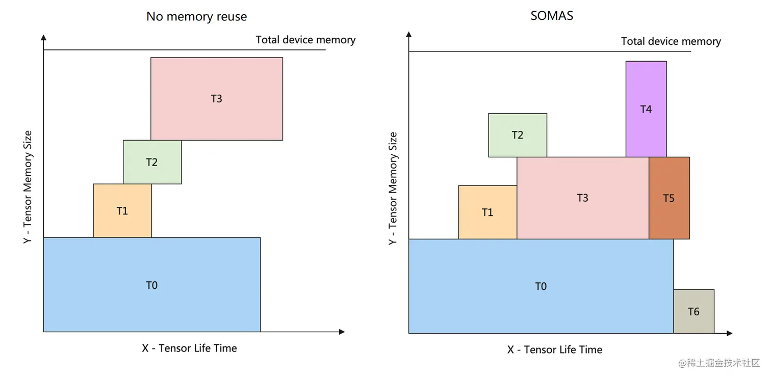 上图中横坐标表示张量的生命周期,图中纵坐标表示内存大小。在生命周期内,某一个张量将一直占用某块设备内存,直至生命周期结束才会释放相应内存块。通过张量生命周期和内存大小可以构造出矩形块,而内存分配要求解的目标是在内存生命周期图中容纳更多的矩形块,问题的约束是矩形块之间无碰撞。 图的左边是在未使用任何内存复用策略的情况下的内存生命周期图,此时内存同时只能容纳 T0、T1、T2、T3 四个张量。内存复用策略的求解是一个 NP 完全的问题。许多深度学习框架通常采用贪心的策略去分配内存,例如采用 BestFit 算法,每次直接从内存池中选取可以满足条件的最小内存块。