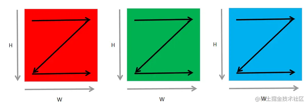 这种格式中,是按照最低维度 W 轴方向进行展开,W 轴相邻的元素在内存排布中同样是相邻的。如果需要取下一个图片上的相同位置的元素,就必须跳过整个图像的尺寸 C⋅H⋅W。
