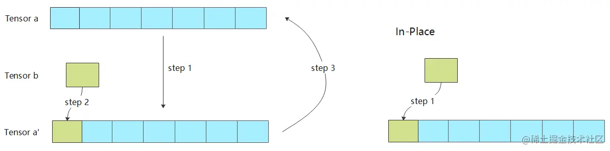 下面以张量的 a[0]=b 操作为例介绍In-Place的优点。下图左边是非 In-Place 操作的实现,step1 将张量 a 拷贝到张量 a’,step2 将张量 b 赋值给张量 a’,step3 将张量 a’ 拷贝到张量 a。图右边是算子 In-Place 操作的实现,仅用一个步骤将张量 b 拷贝到张量 a 对应的位置上。对比两种实现,可以发现 In-Place 操作节省了两次拷贝的耗时(zero-copy,零拷贝),并且省去了张量 a’ 内存的申请。