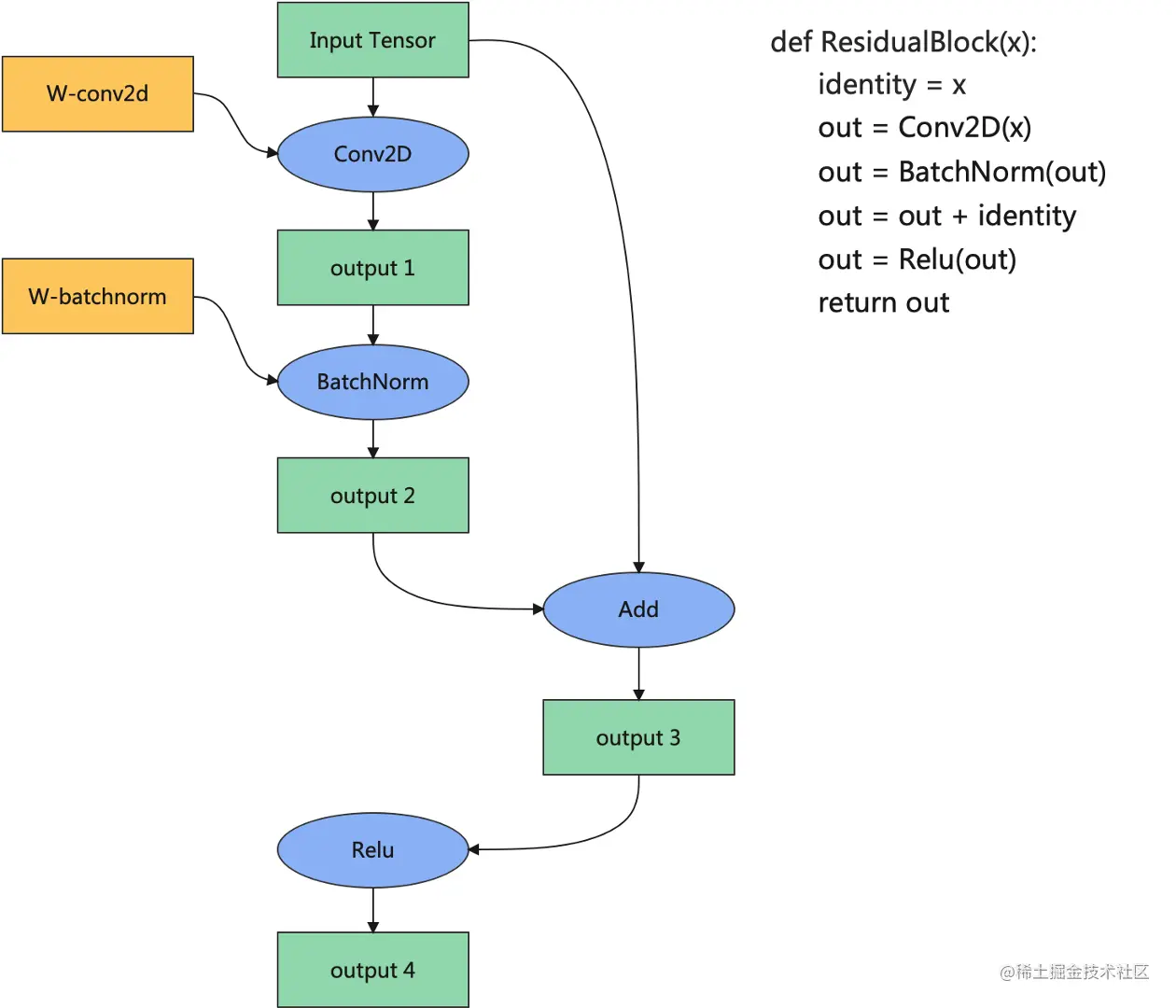 比如下图中当 BatchNorm 算子计算结束后,输出 1 不再被任何算子使用,则该张量的设备内存可以被回收,并且如果输出 1 的内存尺寸大于等于输出 3 的内存尺寸,则从输出 1 回收的地址可以用于输出 3 的内存分配,从而达到复用输出 1 地址的目的。