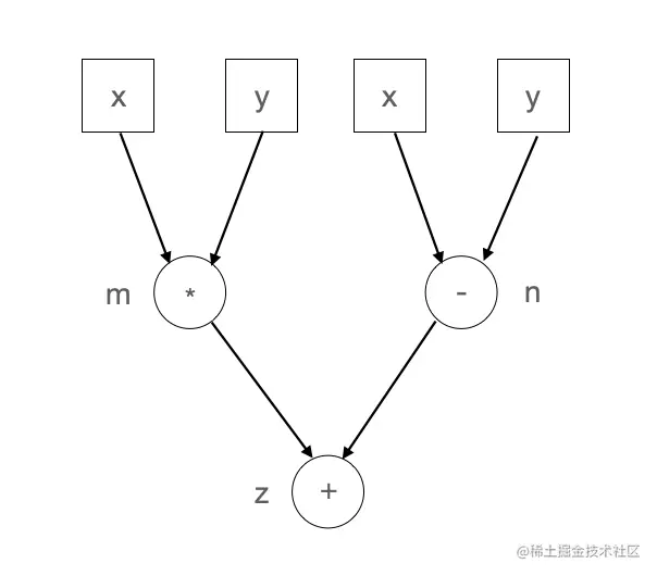 例如上述示例代码的计算逻辑可以表达为下图所示。由该计算图可以看出,其中乘法和减法之间并没有依赖关系,因此这两个计算可以并行执行,而这样的并行执行信息只有将计算表达为计算图后才能完成分析,这也是计算图调度相对于单算子调度的优势之一(静态图相比动态图的优势)。