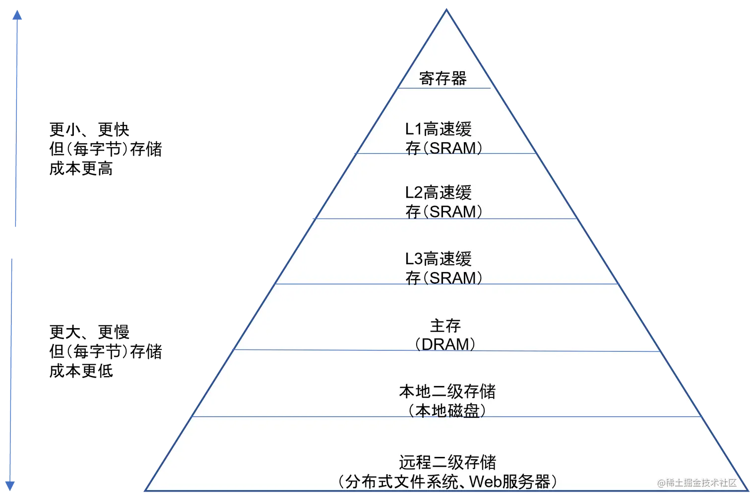 下图是现代计算机的存储结构,越靠近金字塔顶尖的存储器造价越高但是访问速度越快。