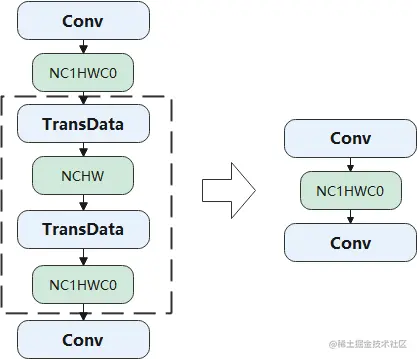 举个例子i:在华为昇腾平台上 Conv 算子在输入和输出的内存排布为 5HD 时是性能最优的,所以可以看到 Conv 算子输出结果的格式是 5HD,然后通过一个转换操作转回了框架缺省的 NCHW,紧接着,后面又是一个 Conv 算子,它需要 5HD 的输入,所以又做了一个 NCHW 到 5HD 的转换。我们很容易看出,虚线框内的两个转换操作互为逆操作,可以相互抵消。通过对计算图的模式匹配,可以将该类型的操作消除,这样可以减少不必要的内存分配和计算操作。