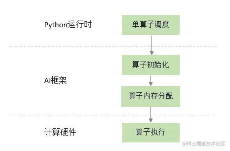 单算子执行的调用链路如下图所示,算子在 Python 侧被触发执行后,会经过机器学习框架初始化,其中需要确定包括算子的精度,输入与输出的类型和大小以及对应的硬件设备等信息,接着框架会为该算子分配计算所需的内存,最后交给具体的硬件计算设备完成计算的执行。
