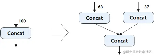 举个例子,假设我们 Concat op 不支持输入个数是 100,最大支持 63,那就拆成 63 + 37 两个 op: