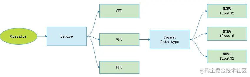 基于数据格式和数据精度这两个概念,在不同硬件下会有不同的算子支持,一个硬件上支持的所有算子的集合定义为该硬件的算子信息库(也就是当前算子的一个 kernel 候选集)。算子选择过程就是从算子信息库中选择最合适算子的过程。