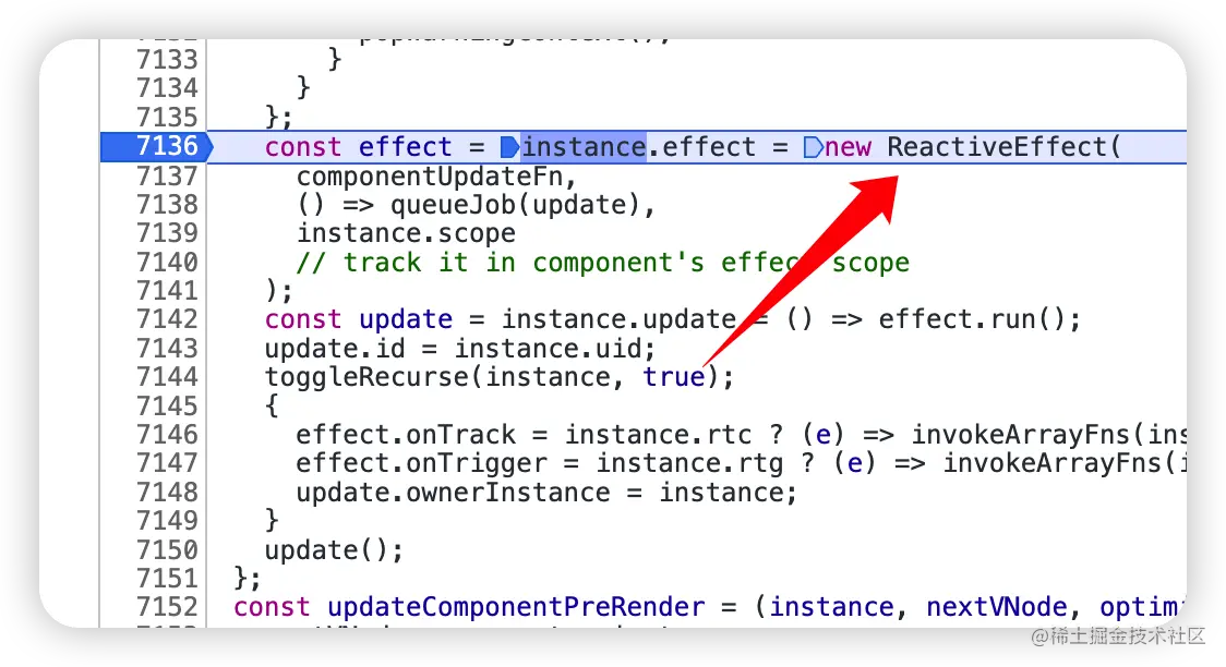 当执行 render 函数访问 reactive 数据,触发 get 拦截方法进行依赖追踪,当数据发现变化,触发 set 进行视图更新,那么起中间桥梁的是 ReactiveEffect