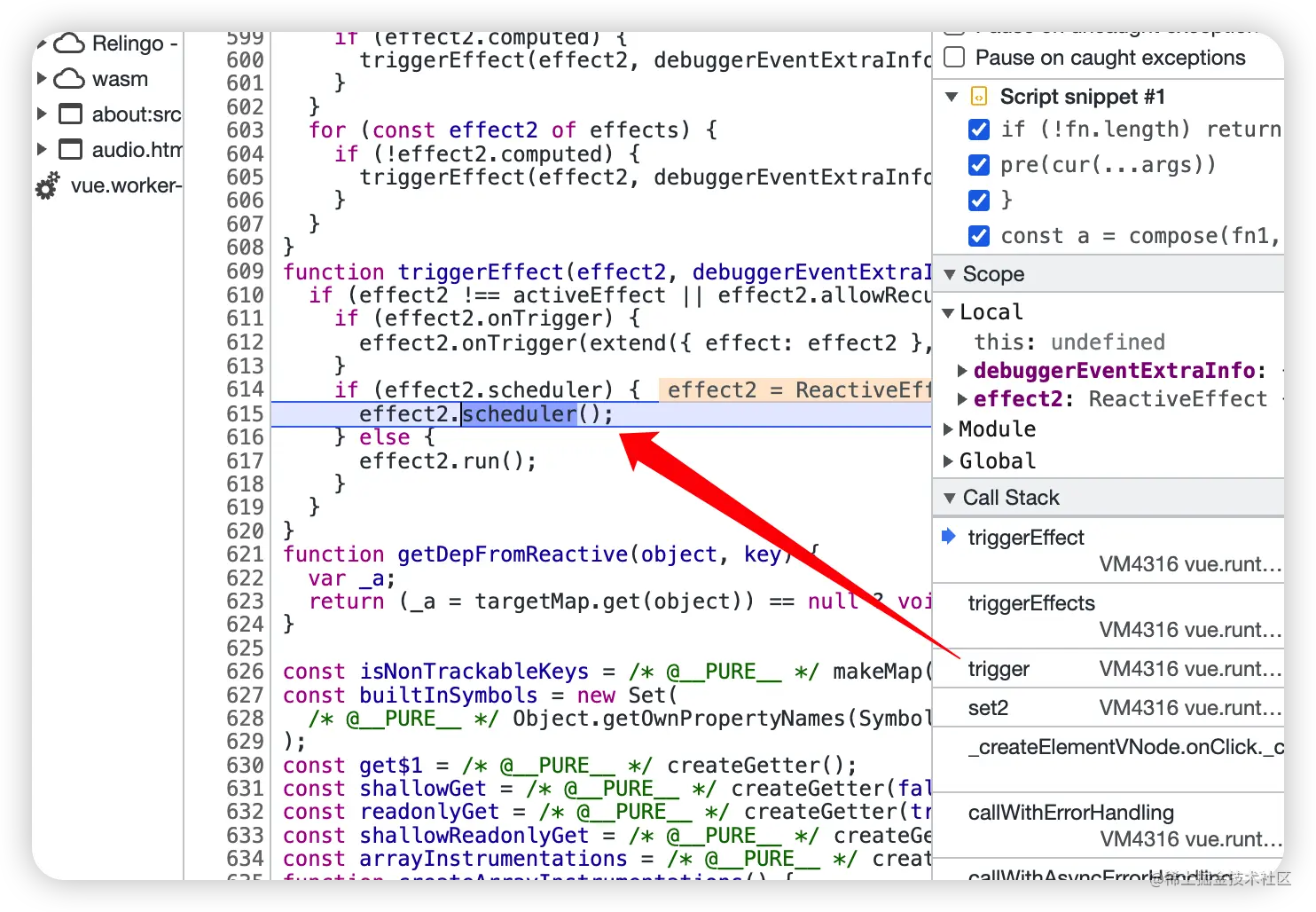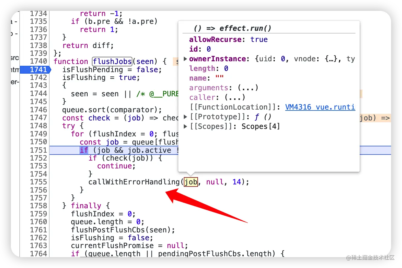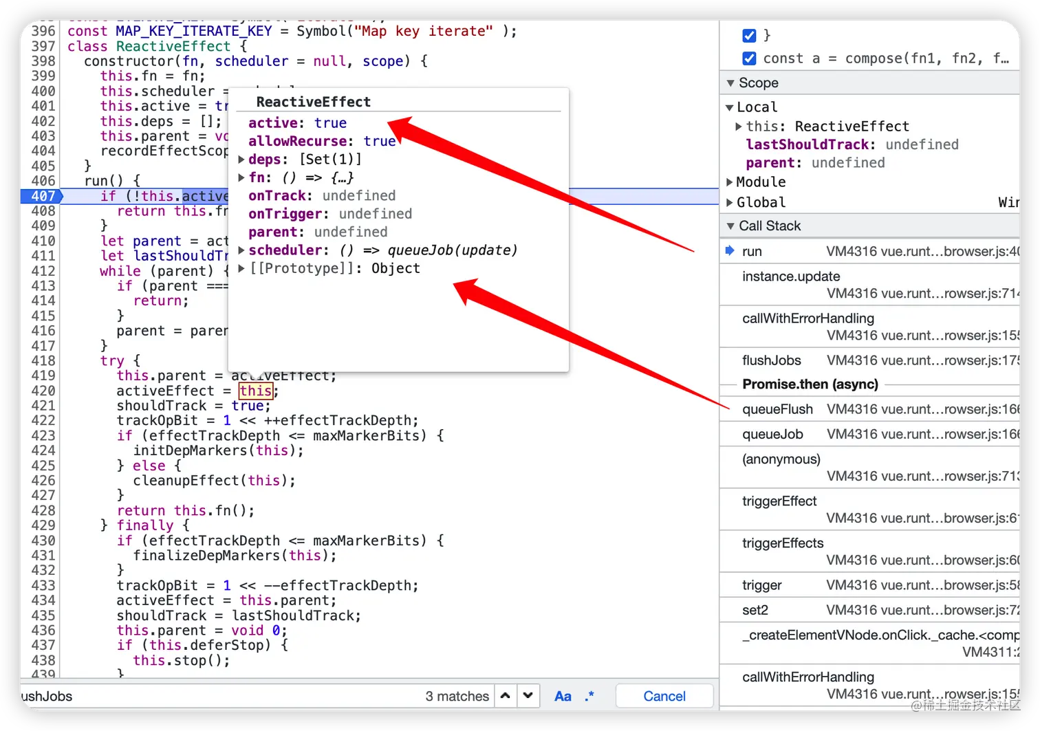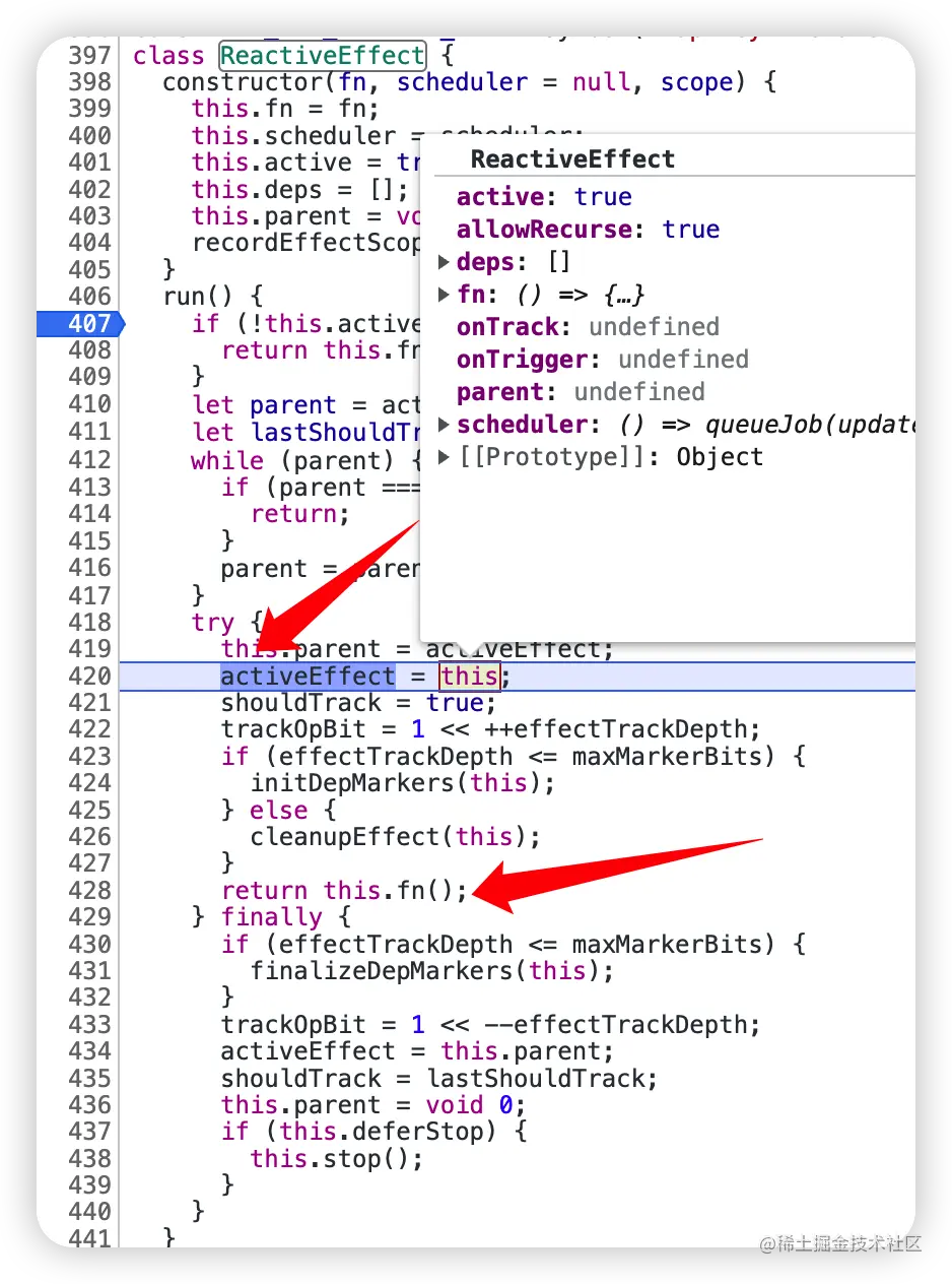 搜索 ReactiveEffect 在 run 打上断点