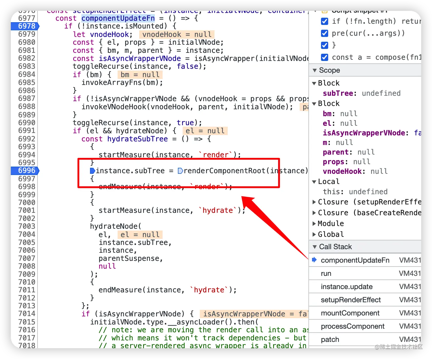 单步进入 fn 执行,也就是执行 componentUpdateFn 组件函数,调用 renderComponentRoot,执行 render 函数
