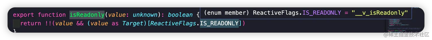 ReactiveFlags 枚举对象会在源码中多个地方引用,isRef, isReadonly 等工具方法都是根据对象是否有这些 key 判断的