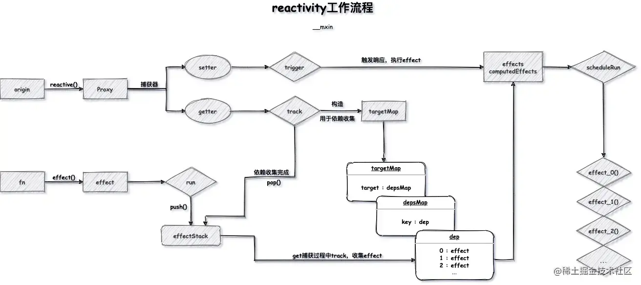 重点理解 run 方法,它执行后,将副作用函数收集到 reactive 对应数据依赖集合上,这时数据和模版 render 关联上了,当修改 reactive 数据,自然可以从依赖中取出,然后执行副作用函数更新视图