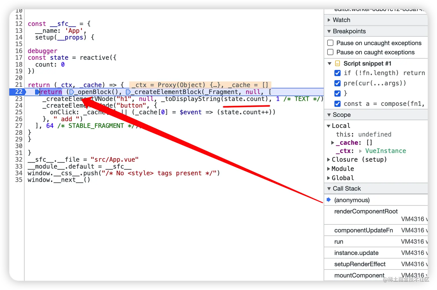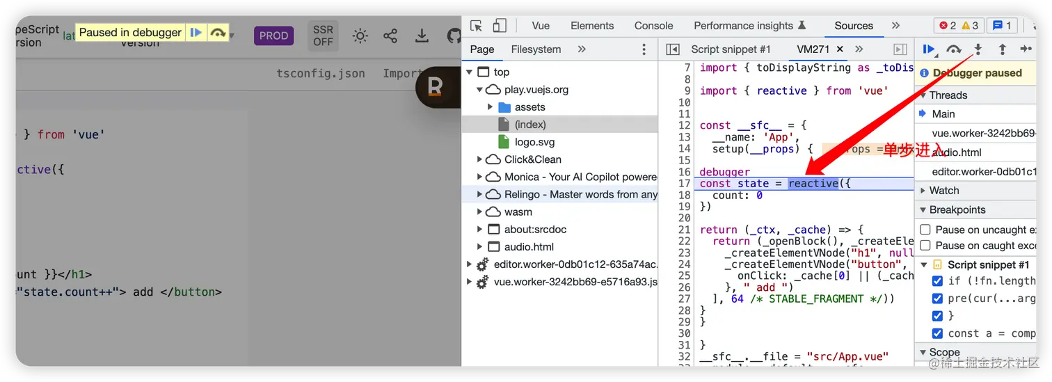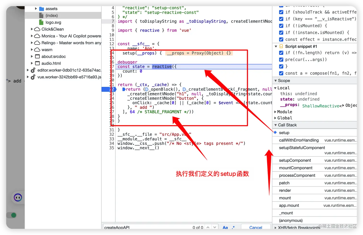 这时就会到了 setup 返回的 渲染函数,内部就会访问到 state.count ,触发它的 get 函数,在 get 函数上打上断点(可以搜索 createGetter)