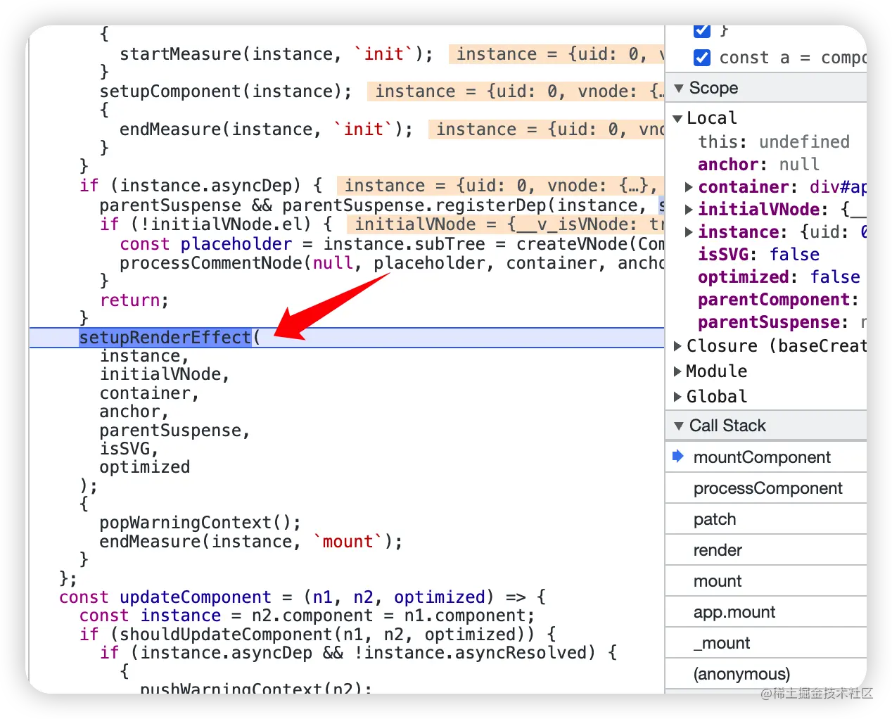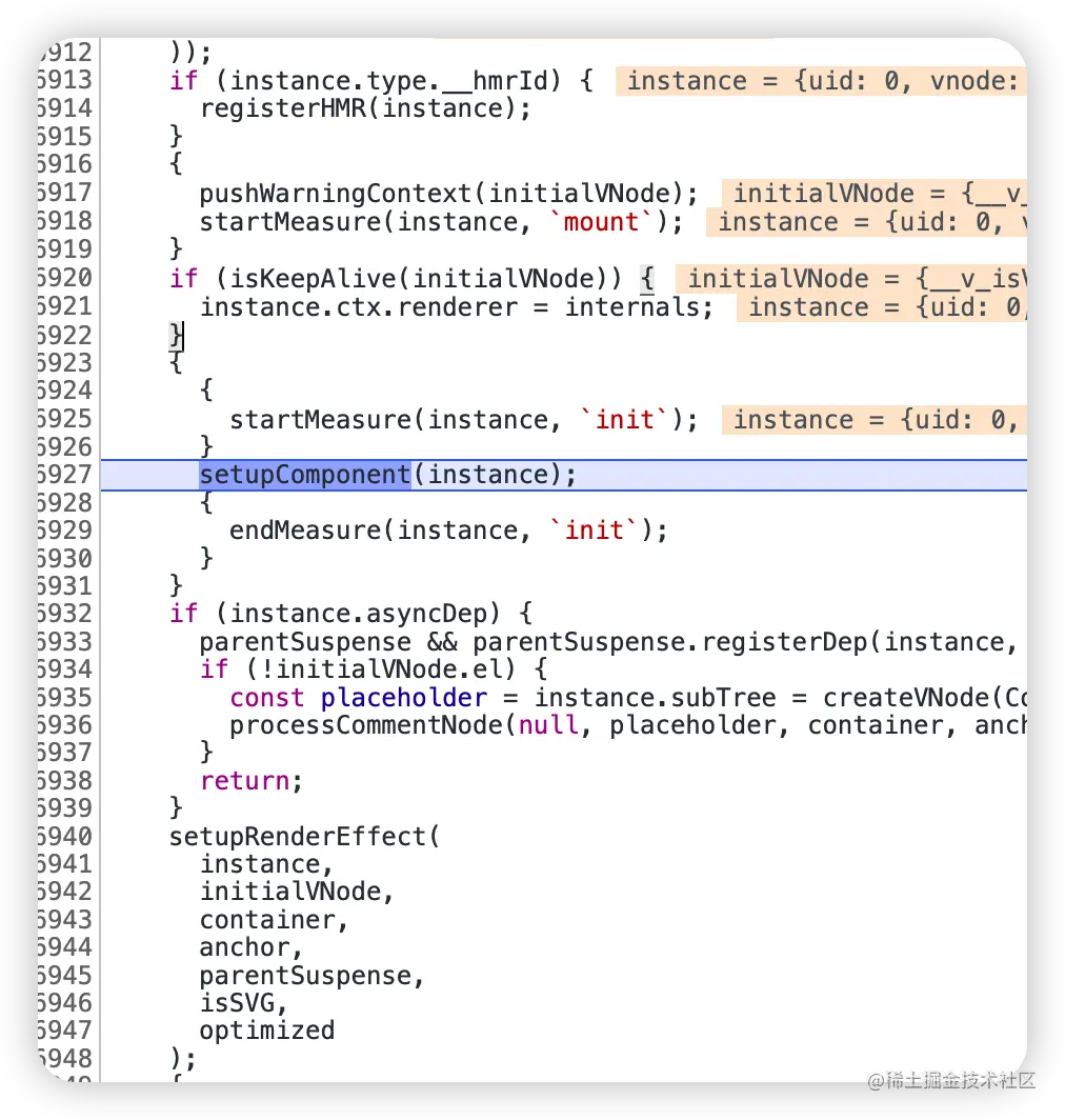 mountComponent 方法调用 createComponentInstance 创建组建实例 instance,将其作为参数传入 setupComponent,主要是调用我们定义的 setup 函数,所以 setup 函数执行时机是在 mount 方法