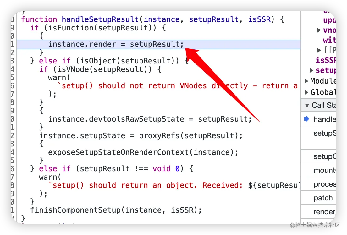 执行 setup 函数,会返回一个函数,在 handleSetupResult 函数,赋值给组件实例的 render 作为渲染函数