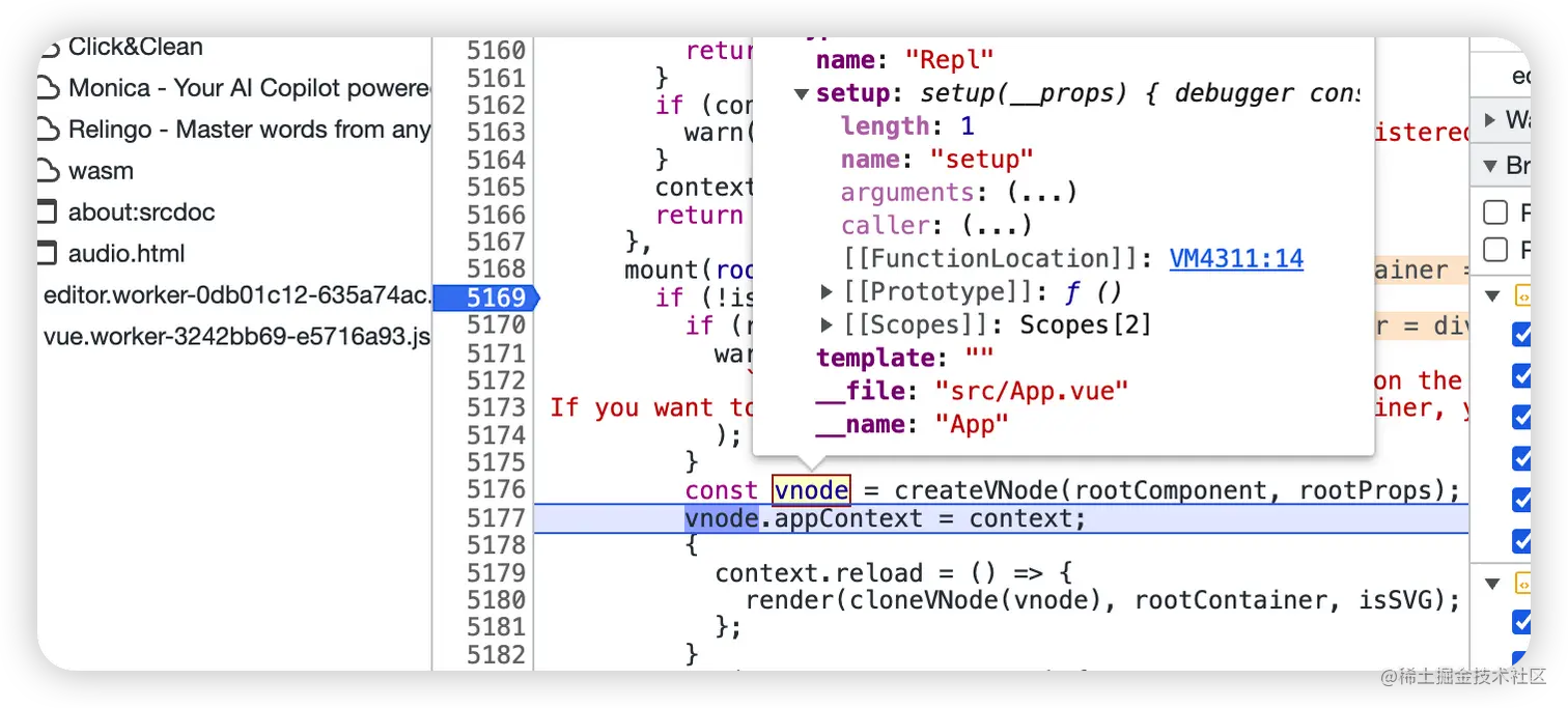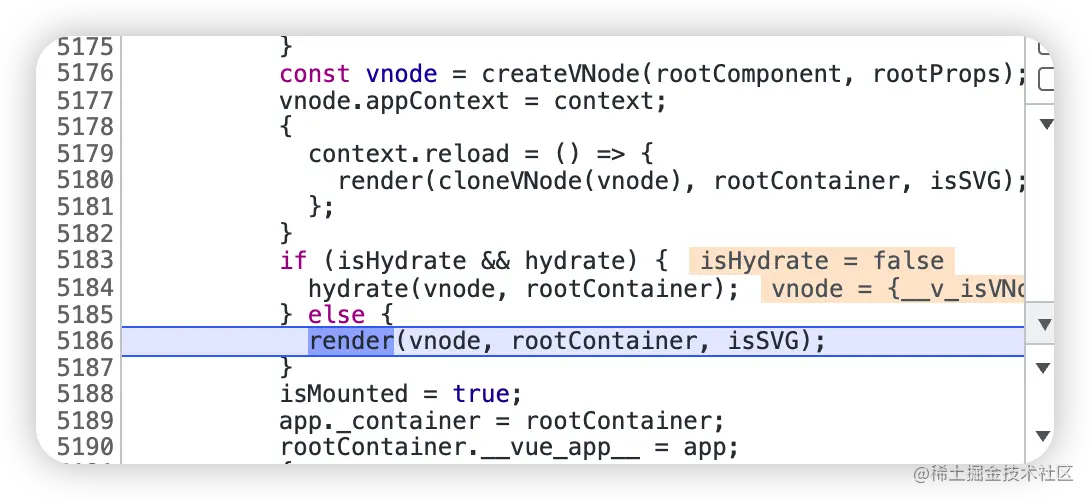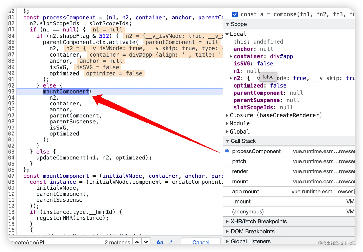 在 vue 文件搜索 createAppAPI,在 mount 挂载方法上打上断点