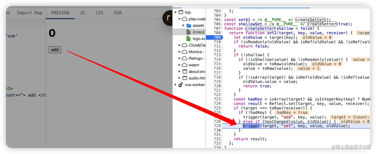 当点击按钮,修改 state.count 值,触发了 set 函数,执行 trigger 派发更新