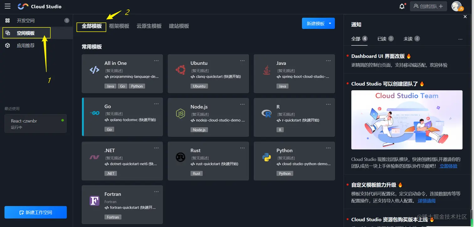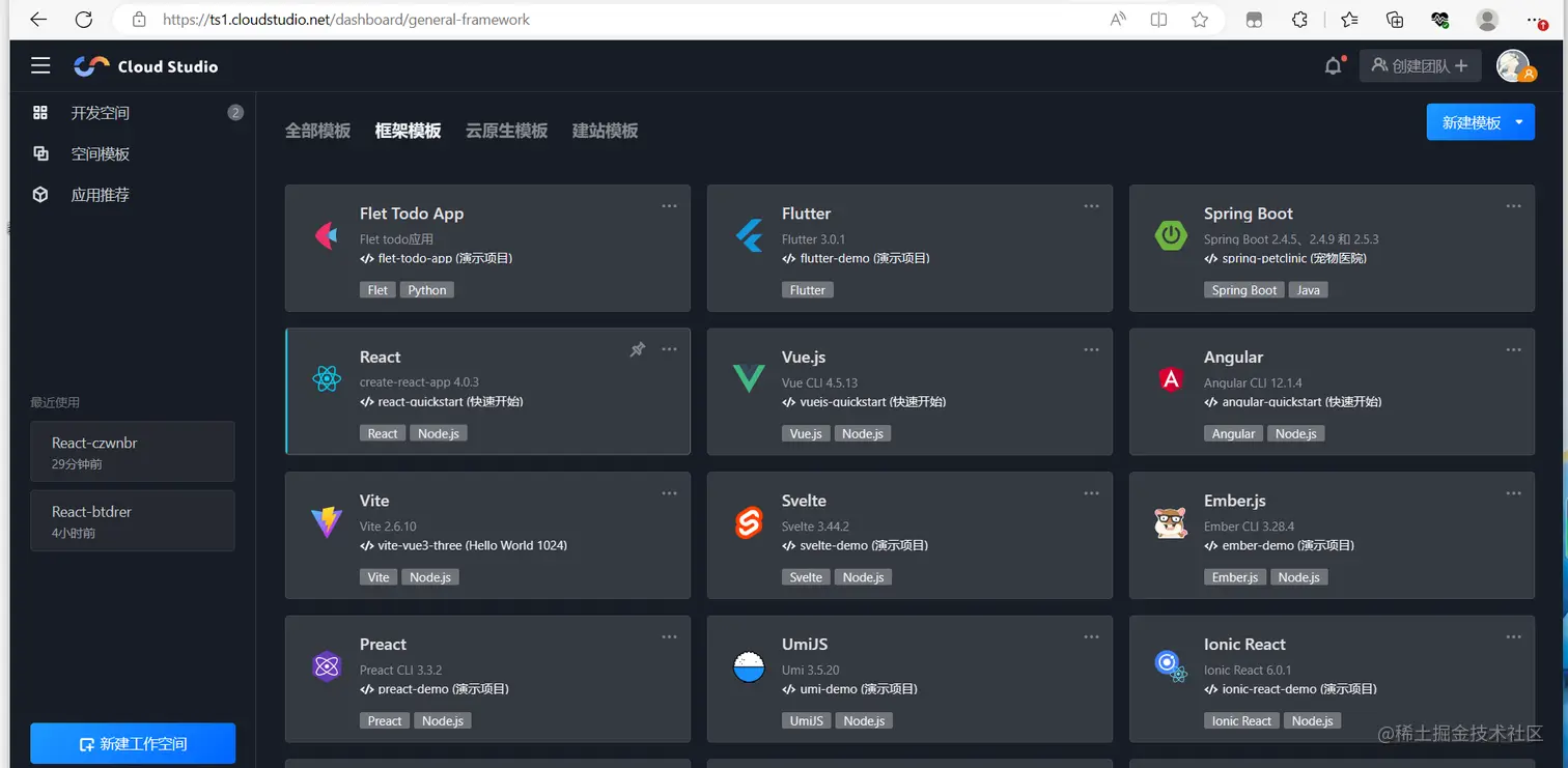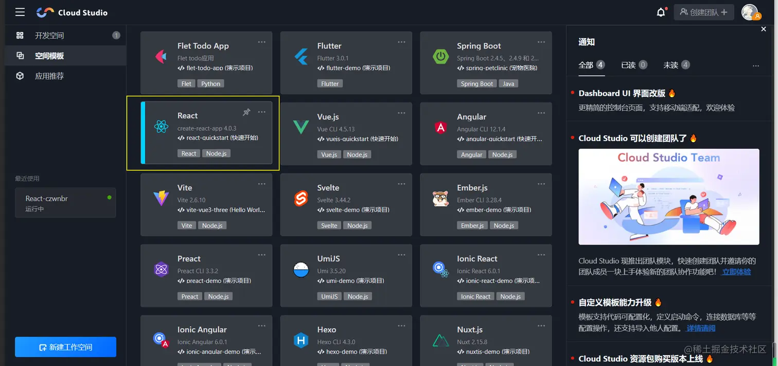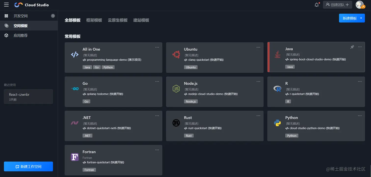 亲爱的小伙伴们,正如我们之前所说的一样,CloudStudio不仅可以帮助您快速搭建react项目,而且同样支持Java、node.js、Flutter等多种项目类型,欢迎大家尝试并体验一下其他项目。