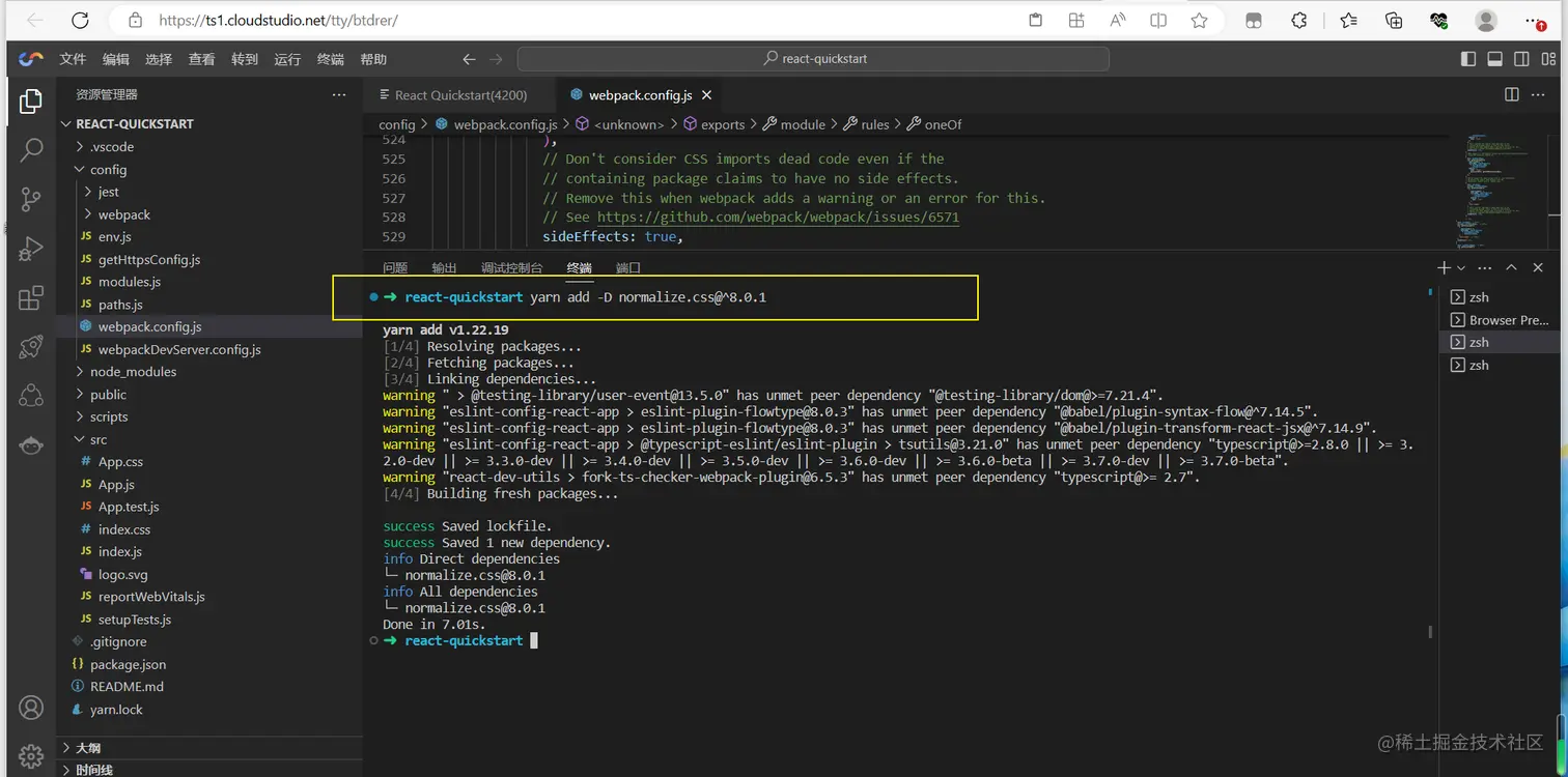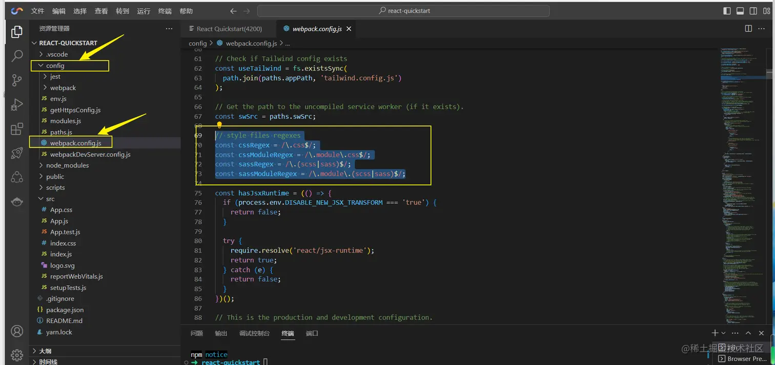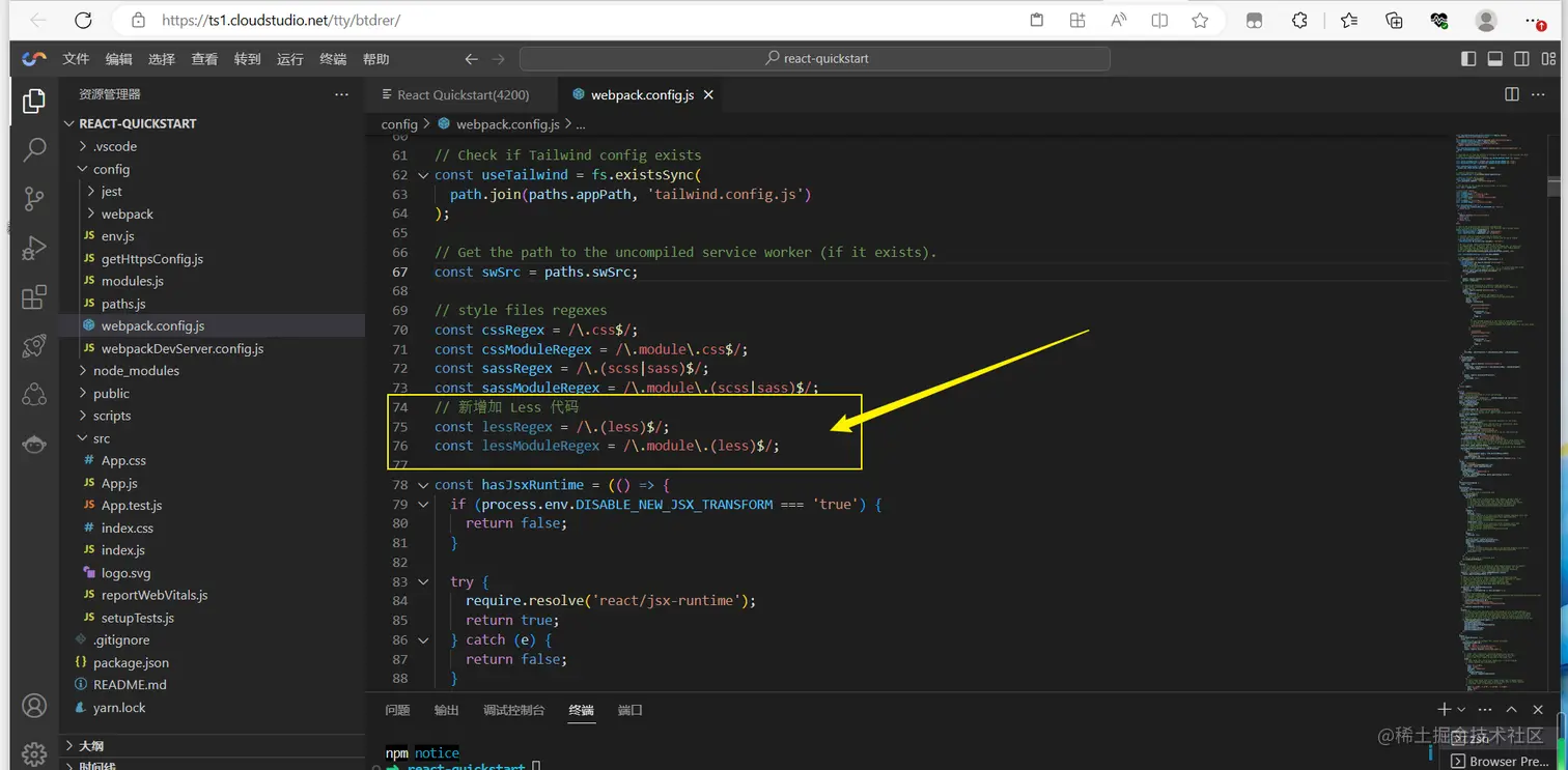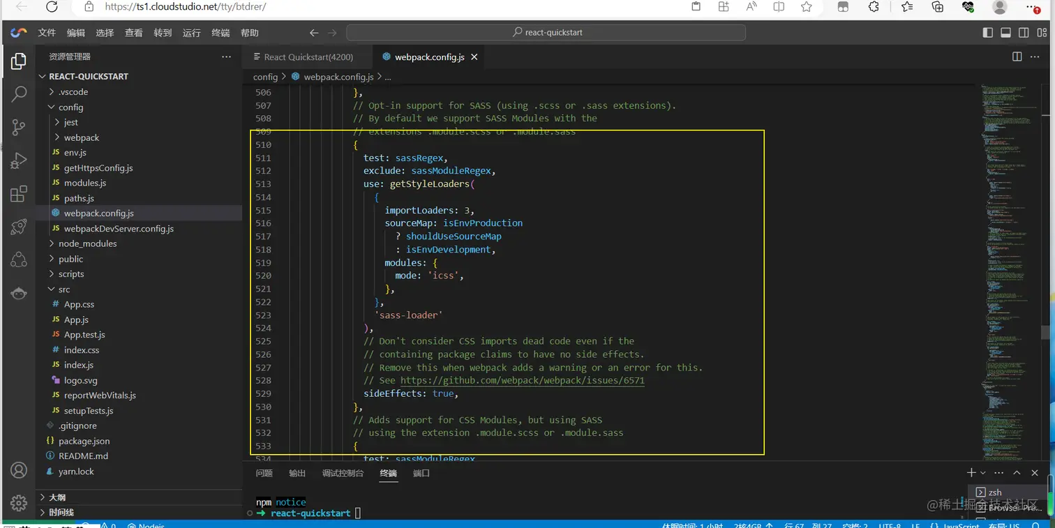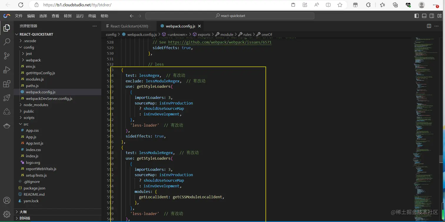 在webpack.config.js中进行配置,这样进行配置需要暴露出React的config配置文件,警告:该操作不可逆。