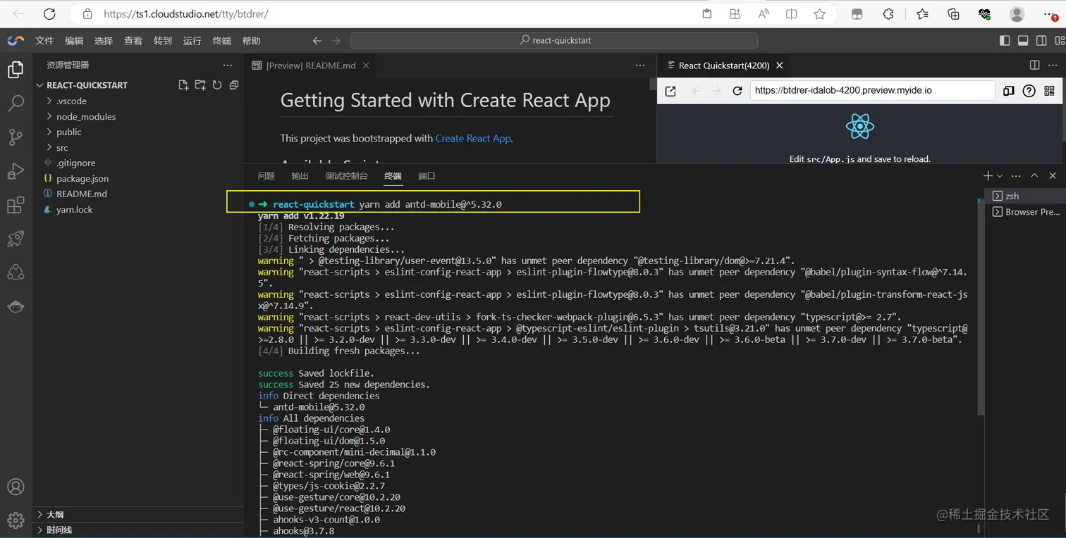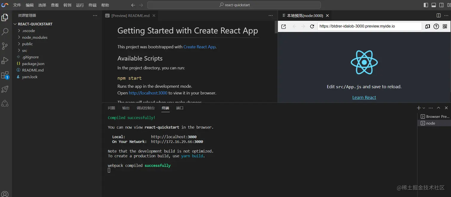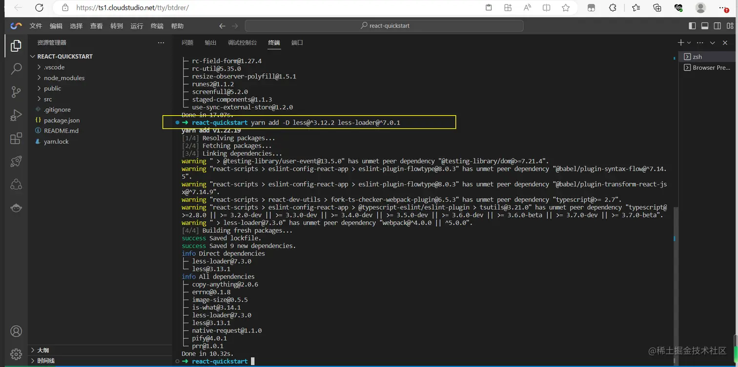 复制完成后,在控制台中输入 yarn dev即可启动该项目。