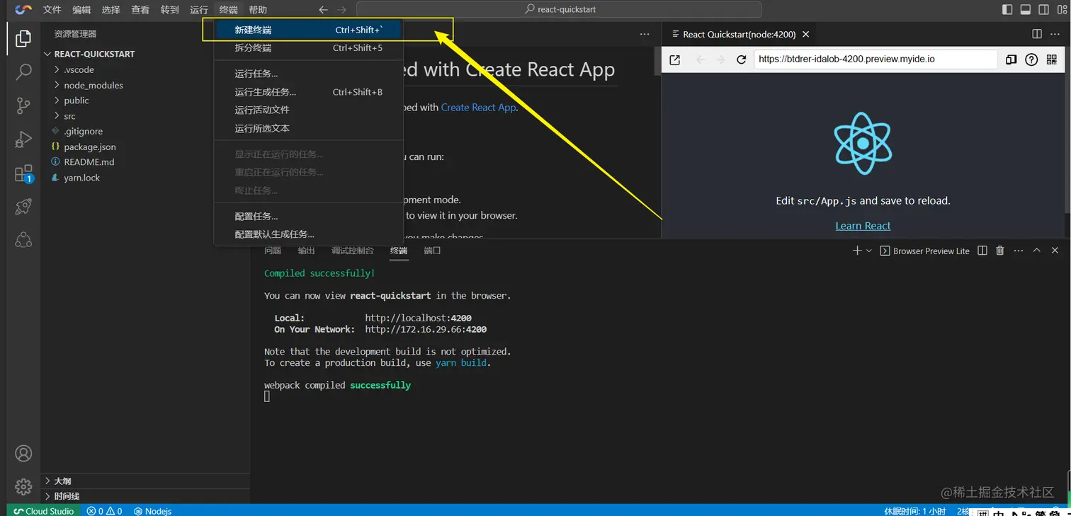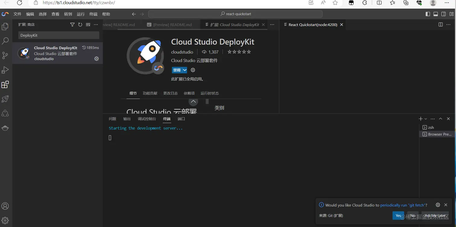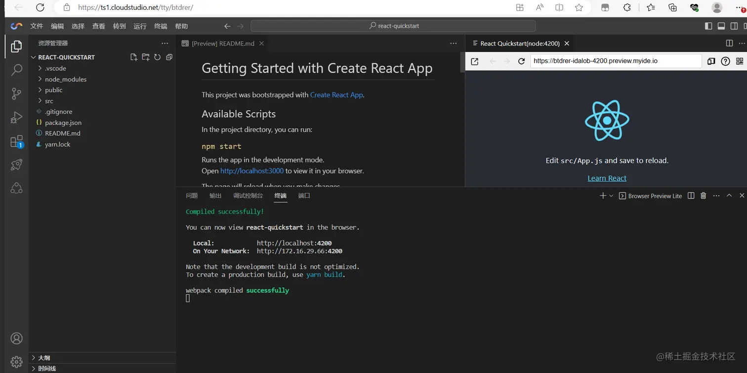 - Cloud Studio 内置预览插件,可以实时显示网页应用,当代码发生改变之后,预览窗口会自动刷新,即可在 Cloud Studio 内实时开发调试网页了