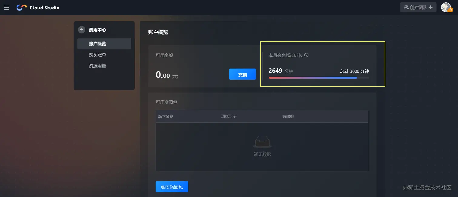 Cloud Studio 团队基于老用户使用体验角度和新用户上手成本考虑,现实行每月赠送 3000 分钟的工作空间免费时长 。当月时长用完即止,未使用的时长不予保留和累加,下月刷新清零再给予 3000 分钟免费时长;