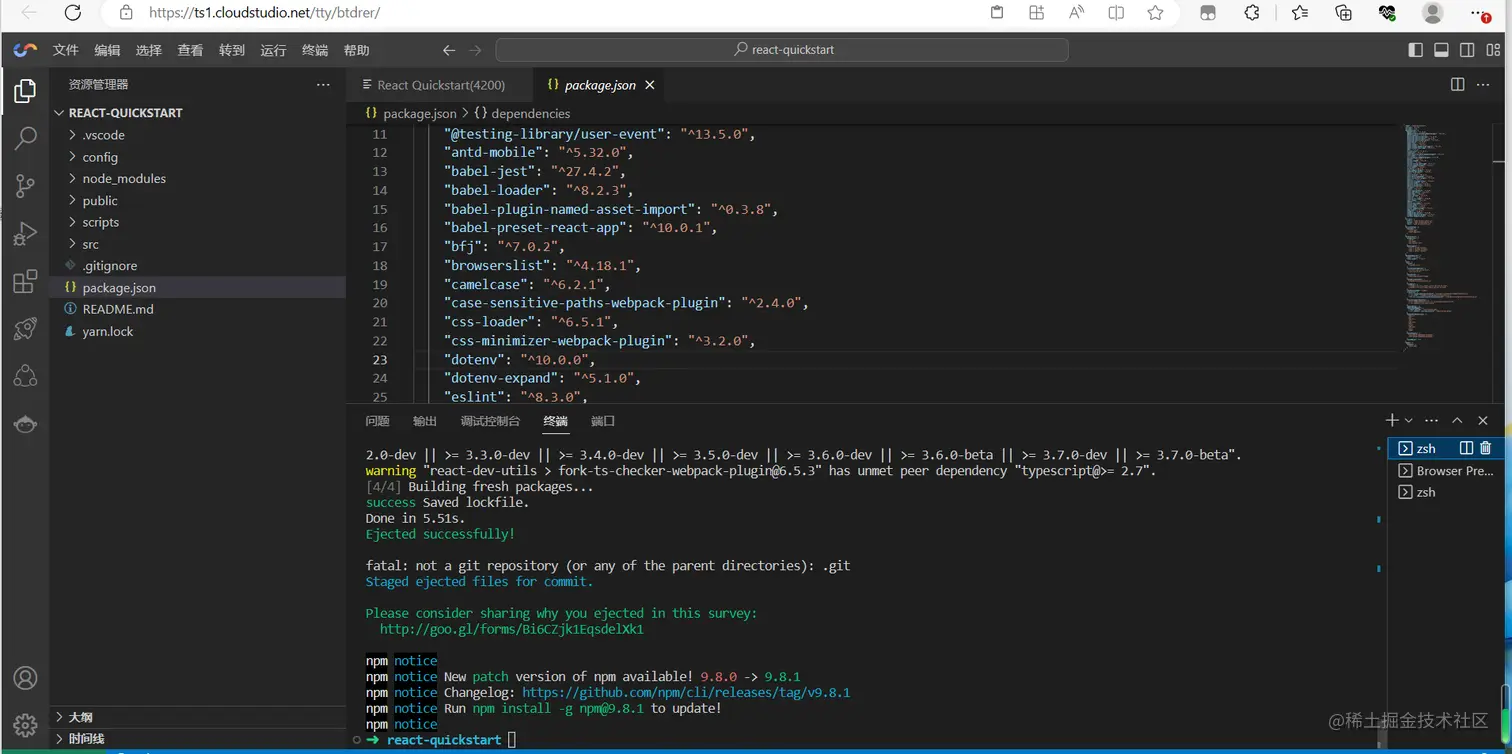 完成命令之后,项目根目录会出现一个config文件夹,里面是一些配置相关的脚本,也可以看到 package.json 中多了很多属性值,如 "dependencies".