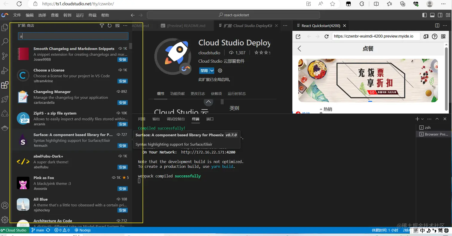 Cloud Studio 作为在线 IDE,包含代码高亮、自动补全、Git 集成、终端等 IDE 的基础功能,同时支持实时调试、插件扩展等,可以帮助开发者快速完成各种应用的开发、编译与部署工作。