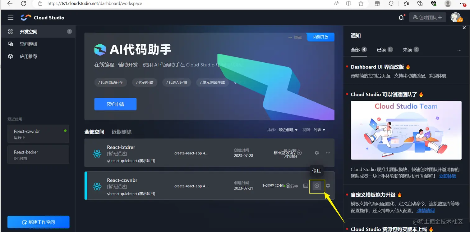 因此,需要提醒一下用户,关闭网页后,还需手动停止工作空间。