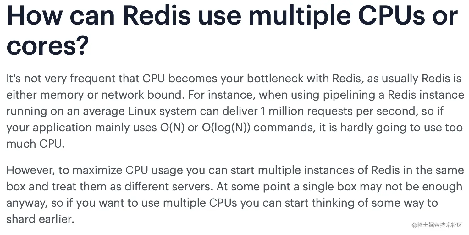 我们都知道单线程的程序是无法利用服务器的多核 CPU 的,那么早期 Redis 版本的主要工作(网络 I/O 和执行命令)为什么还要使用单线程呢?我们不妨先看一下Redis官方给出的FAQ (opens new window)。