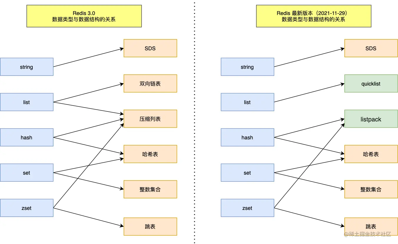 我画了一张 Redis 数据类型和底层数据结构的对应关图,左边是 Redis 3.0版本的,也就是《Redis 设计与实现》这本书讲解的版本,现在看还是有点过时了,右边是现在 Redis 7.0 版本的。