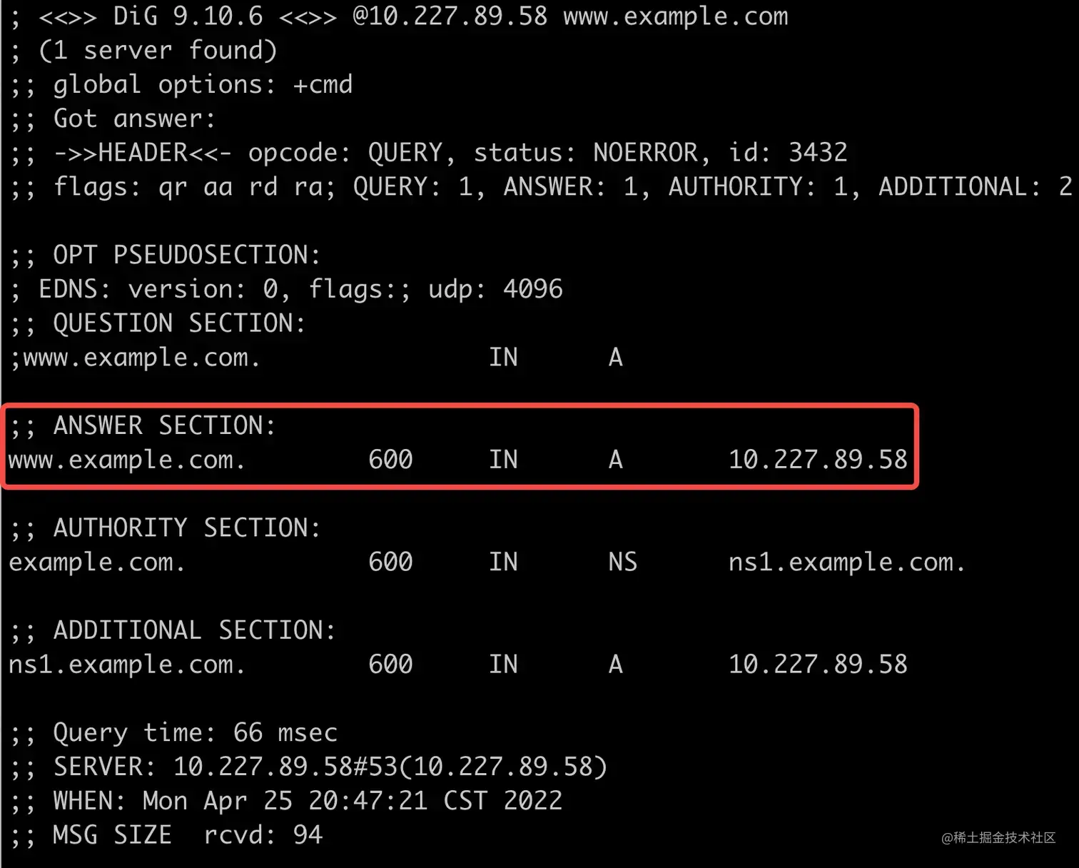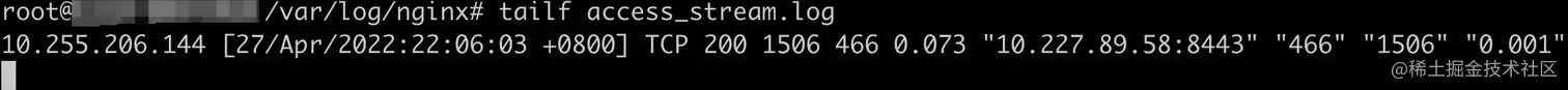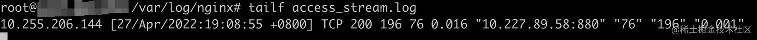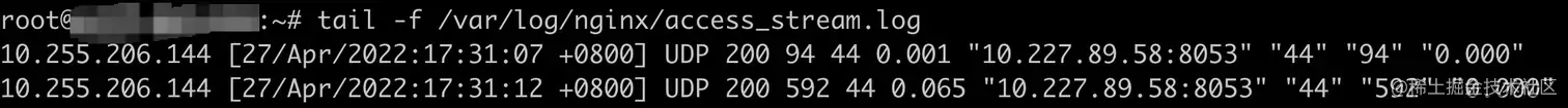 此处dig的验证效果和4.3.3表面上看似无异,但是4层流量是经过nginx stream模块转发的,这里我们可以查询转发日志查询UDP流量转发详情。