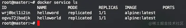 ID NAME MODE REPLICAS IMAGE PORTS e2b2aoag8kr0 redis replicated 3/3 redis:6.0-alpine root@master:~#