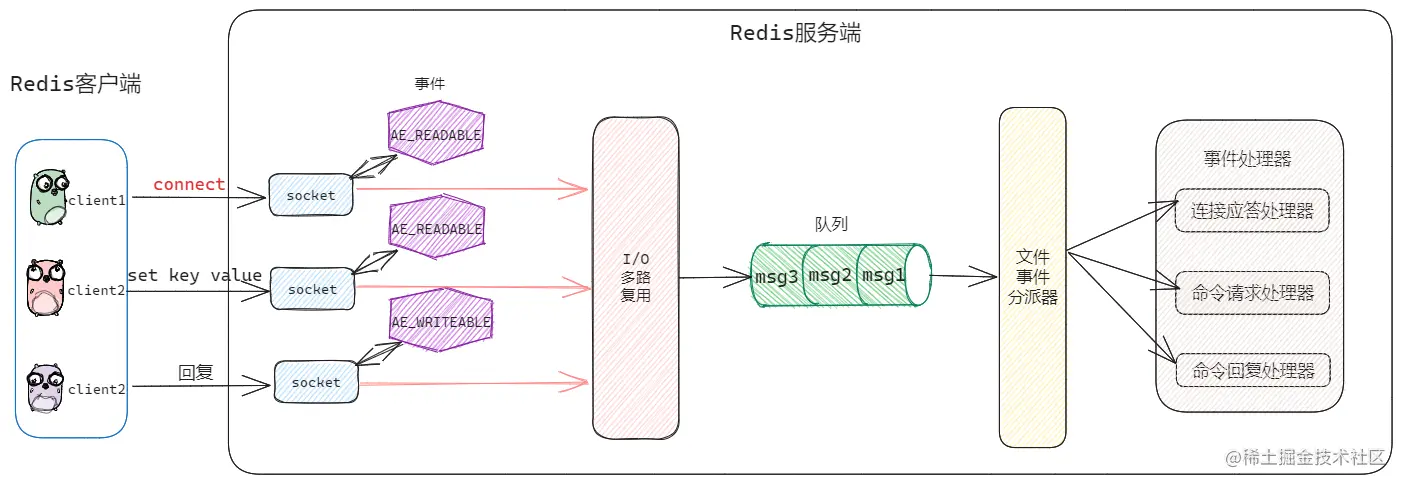 Redis 客户端与 Redis 服务端建立连接,发送命令,Redis 服务器响应命令都是需要通过事件机制。