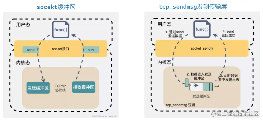 每个 socket 被创建后,会分配两个缓冲区,输入 (发送)缓冲区和输出 (接收)缓冲区。在执行 send 之后,数据只是拷贝到了socket输入缓冲区,而什么时候向网络中输出,是由操作系统安排决定的。 一旦将数据写入到缓冲区,函数就可以成功返回,在识别到是 TCP协议后,再由 TCP 协议将数据从缓冲区一路发送到目标机器。 读取函数也是如此,它也是从输入缓冲区中读取数据,而不是直接从网络中读取。 注意:数据有可能刚被写入缓冲区就发送到网络,也可能在缓冲区中不断积压,多次写入的数据被一次性发送到网络,这取决于当时的网络情况、当前线程是否空闲等诸多因素,不由程序员控制
