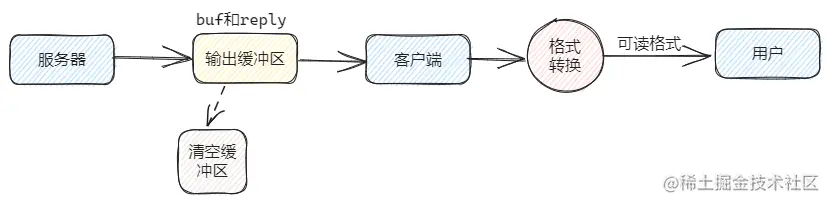 命令实现函数会将命令回复保存到客户端的输出缓冲区里面,并为客户端的套接字关联命令回复处理器,当客户端套接字变为可写状态时,服务器就会执行命令回复处理器,将保存在客户端输出缓冲区中的命令回复发送给客户端。