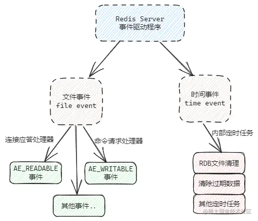 时间事件(time event):定时触发的事件,负责完成redis内部定时任务,如生成RDB文件、清除过期数据等