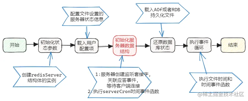 Redis服务器启动后,需要经过一些列的初始化及配置的设置,比如状态参数、用户配置、初始化数据结构等,主要包括下面这些。