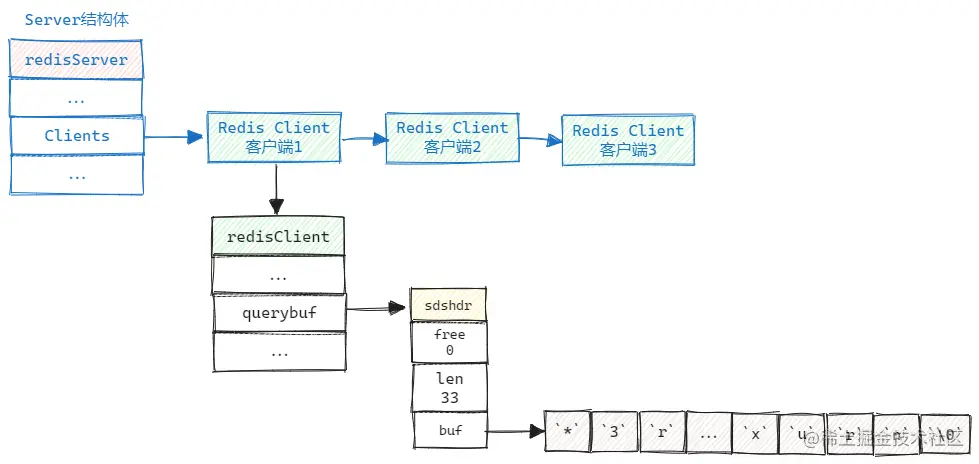 通过连接套接字让客户端的写入而变得可读,服务端将读取协议内容,并存储到客户端的缓冲区,这里的缓冲区是client结构的输入缓冲区。