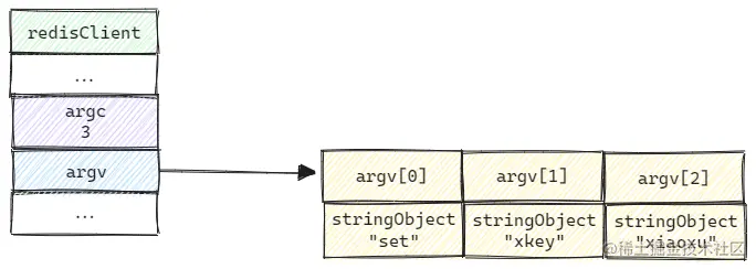 接着会对输入缓冲区中的命令请求进行分析,提取解析出命令请求中包含的命令参数,以及命令参数的个数,然后分别将参数和参数个数保存到客户端状态的argv属性和argc属性里面。