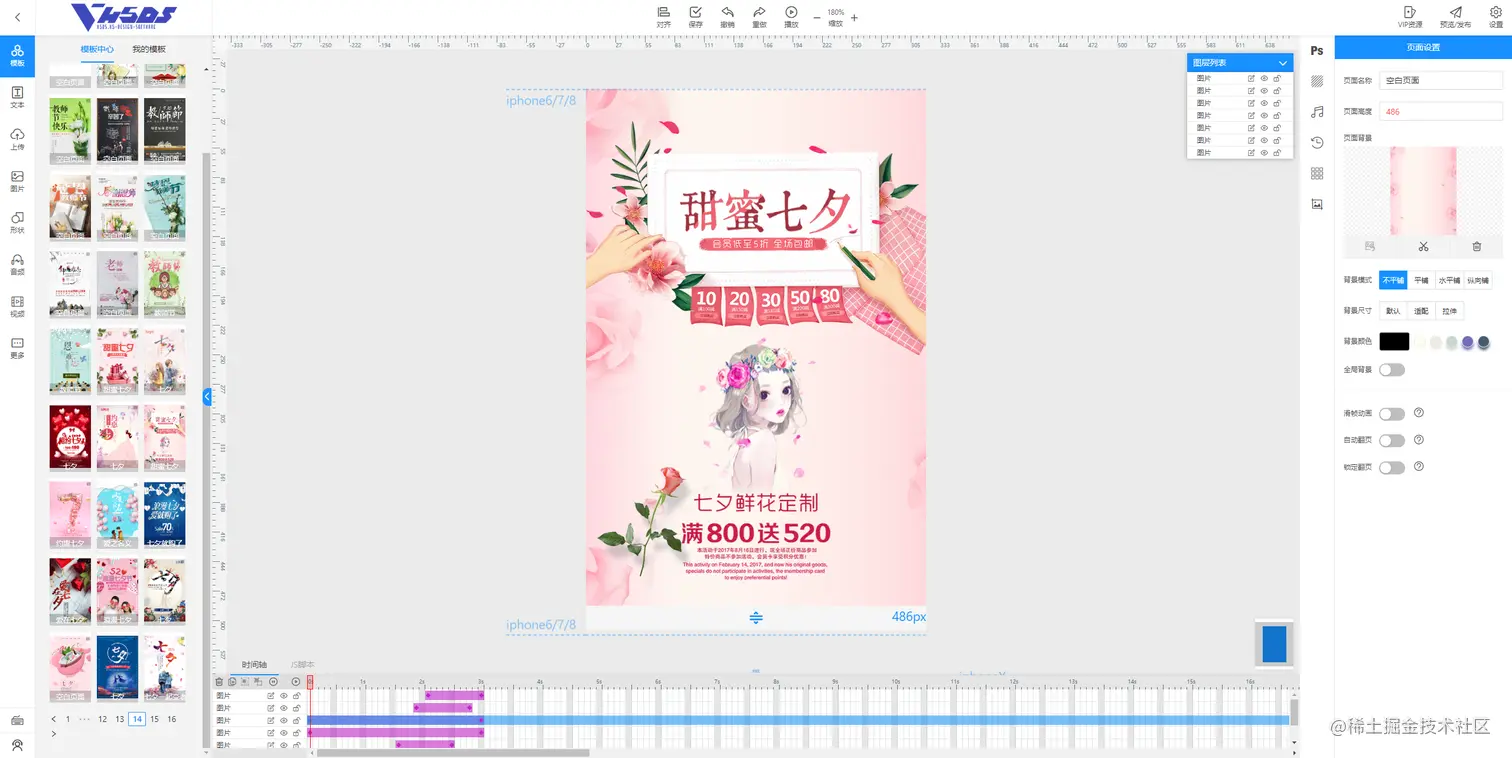 所有功能一目了然,在设计过程中仅需拖拽素材,改变文字大小颜色,就可轻松完成一张实用的h5页面,另外编辑器本身自带丰富模板可套用,大部分模板均可免费使用。